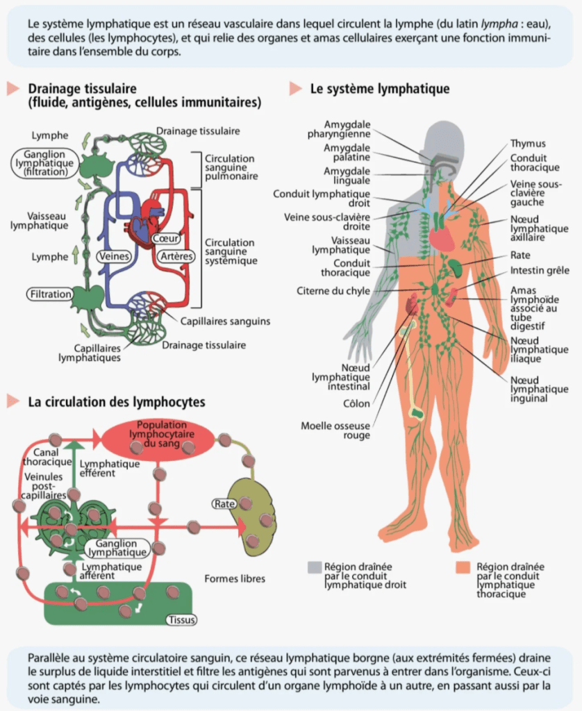 Le système lymphatique est un réseau complexe de vaisseaux, de ganglions et d’organes lymphoïdes qui accompagne le système sanguin. Il assure plusieurs fonctions essentielles :